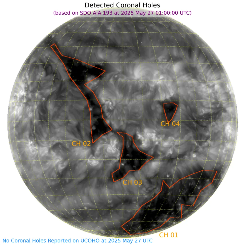 その他、北半球西寄り、南半球中心付近、北半球東端から南半球西よりにかけてナナメに広がるコロナホールがあります