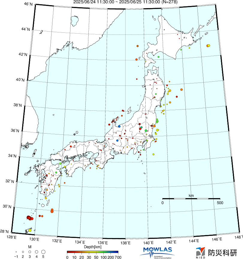 ●Hi-net日本地震分布と気象庁・・・hi-netの小笠原のデータは掲載日がずれて反映されるようです(翌々日に掲載)。掲載されないものもあるようなので気象庁の画像も付けます