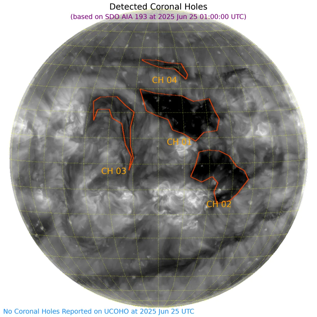 北半球中心付近に3つ、赤道付近西よりに1つ、コロナホールがあります