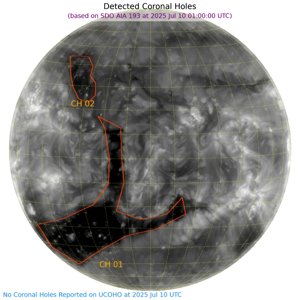 南半球東端から、東西は西寄り、南北は赤道超えて北半球まで伸びるコロナホールがあります