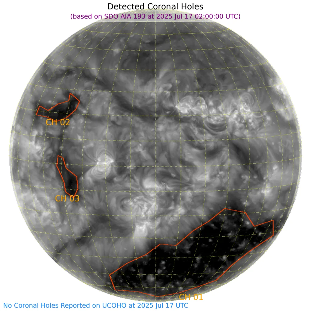 南の極付近、東側から南半球西端まで広がるコロナホールがあります