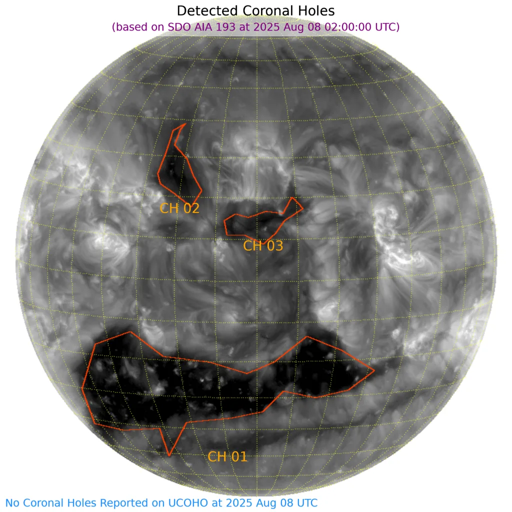 南半球(やや高緯度)に東端から西側にかけて東西に広がる大きなコロナホールがあります