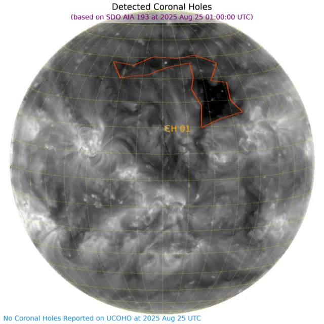 北半球西寄りから東よりにかけて広がるコロナホールがあります