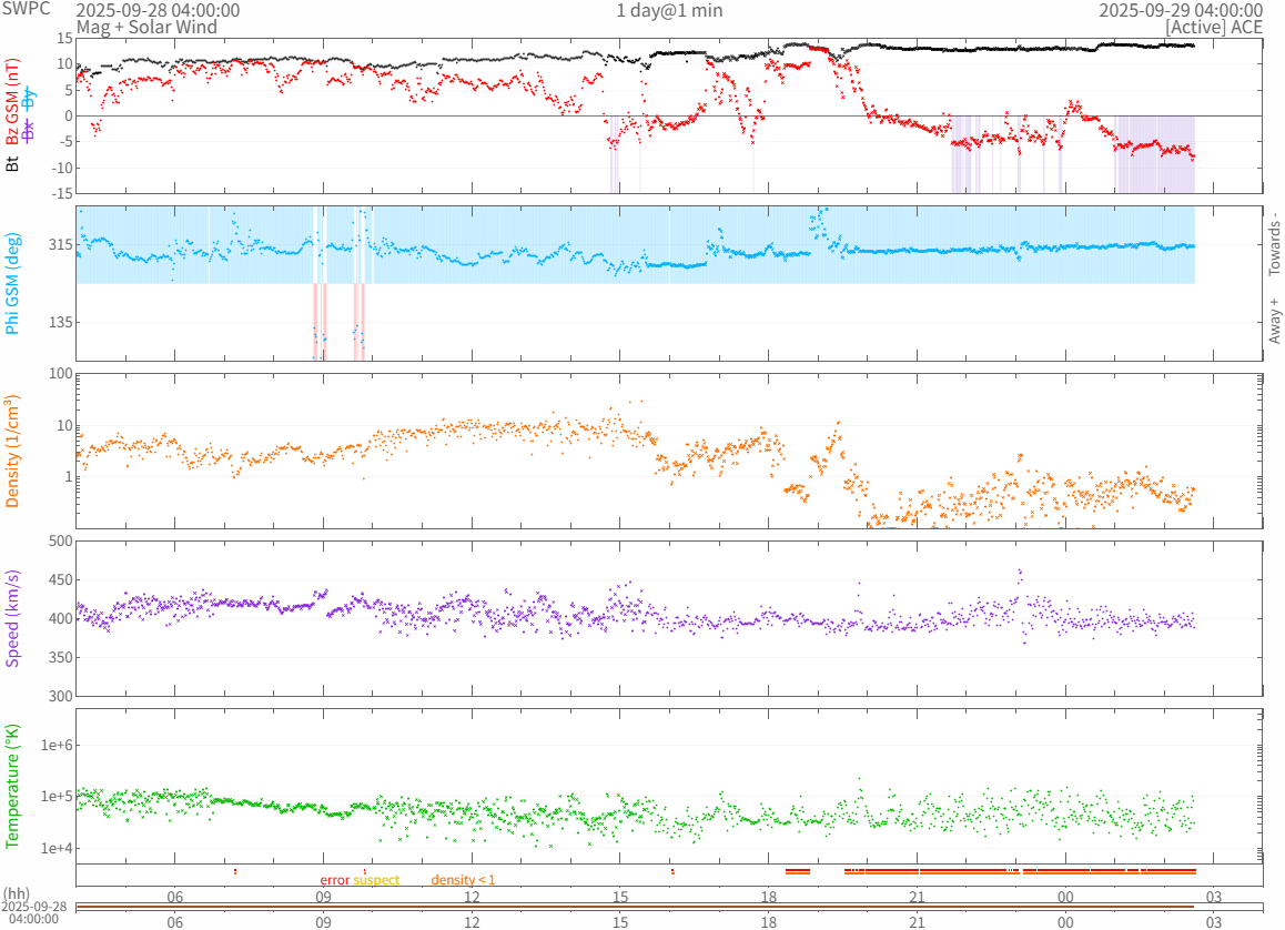 時折450km/s前後まで上がりますが、引き続き400km/s前後で推移しています