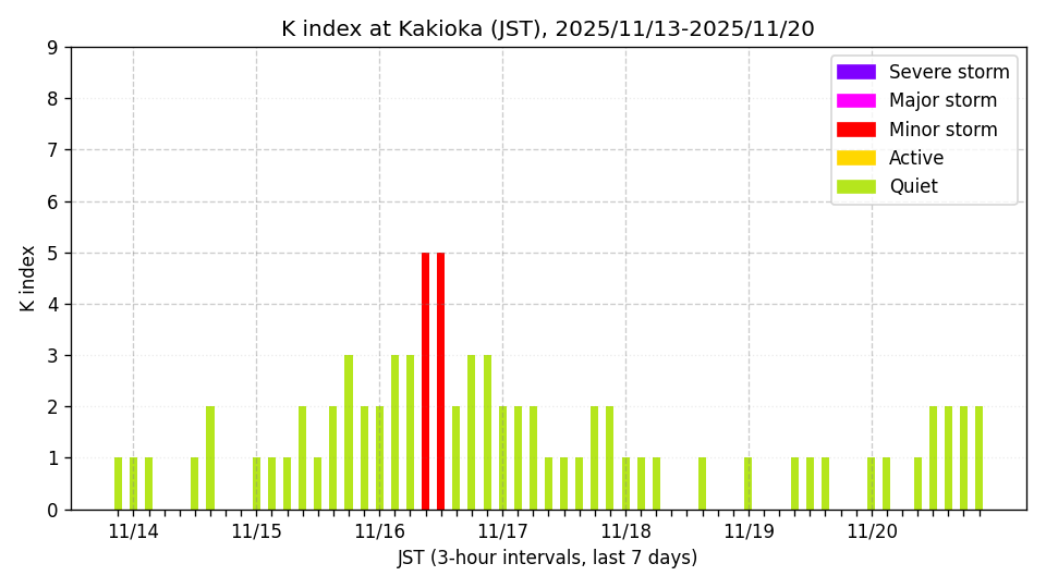 ※3時間ごとのK指数(JST, 過去7日分)。色分けはNICTのアラートレベルに準拠。