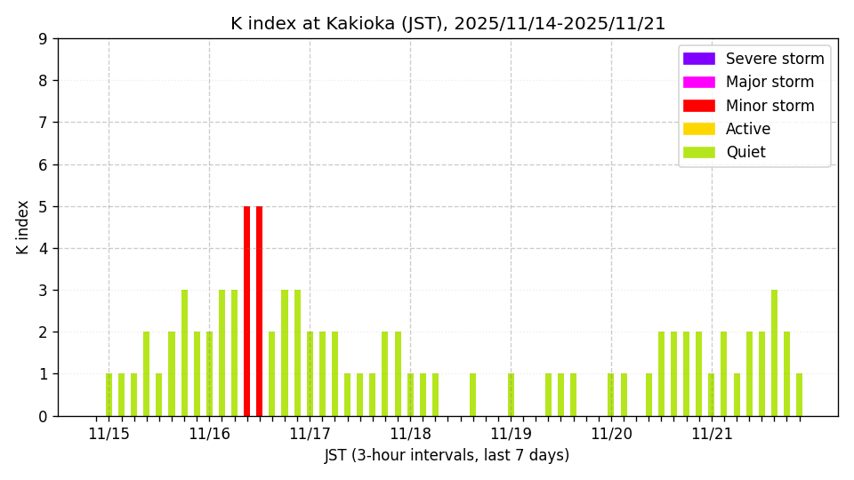 ※3時間ごとのK指数(JST, 過去7日分)。色分けはNICTのアラートレベルに準拠。