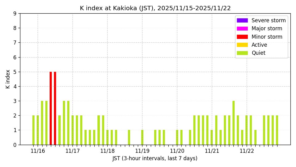 ※3時間ごとのK指数(JST, 過去7日分)。色分けはNICTのアラートレベルに準拠。