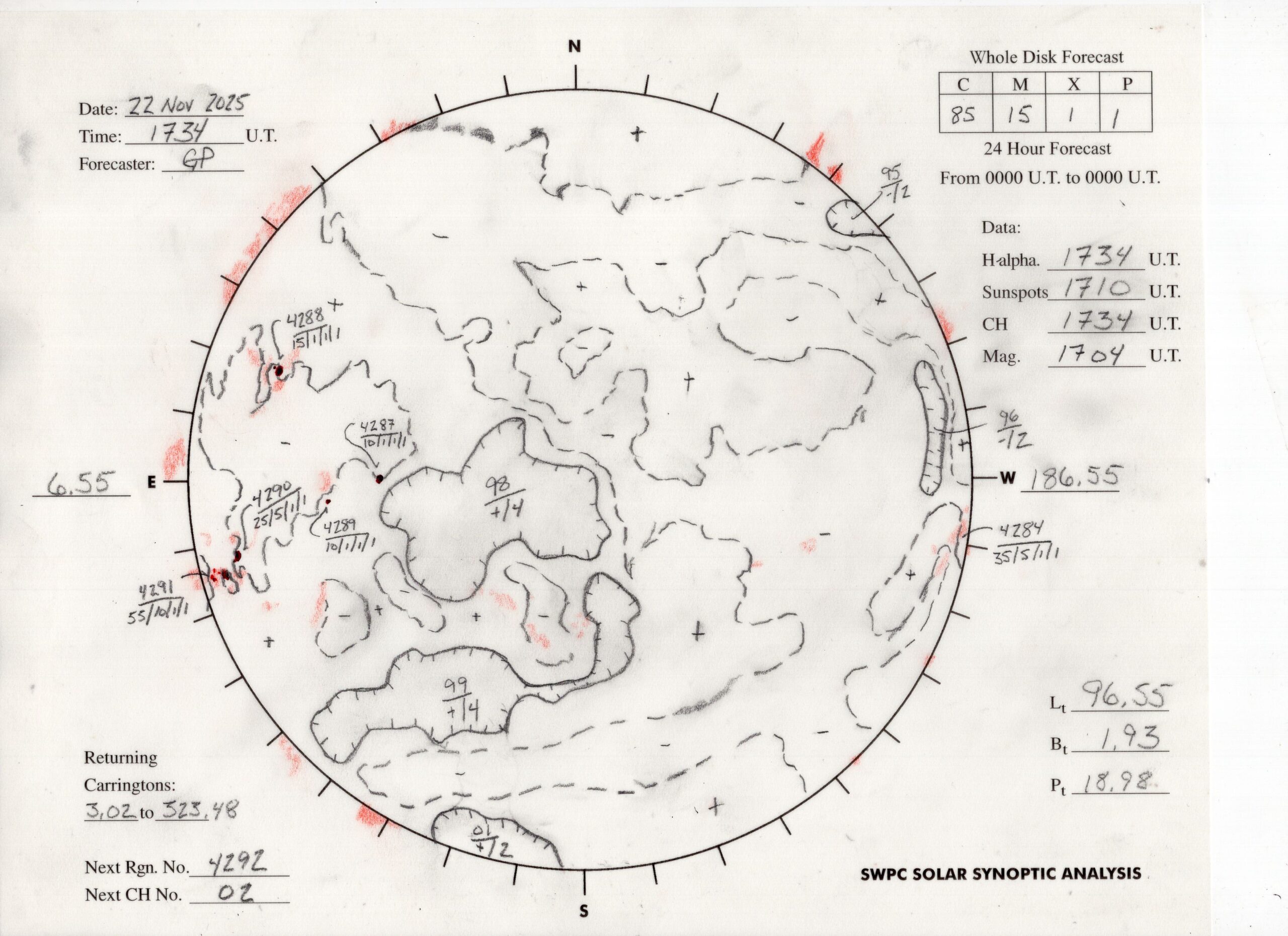 本日のまとめ:南半球東端から回り込んできた4291がやや活発なようです。黒点数は074、地磁気はSum 13 前後。詳報は各セクションへ。