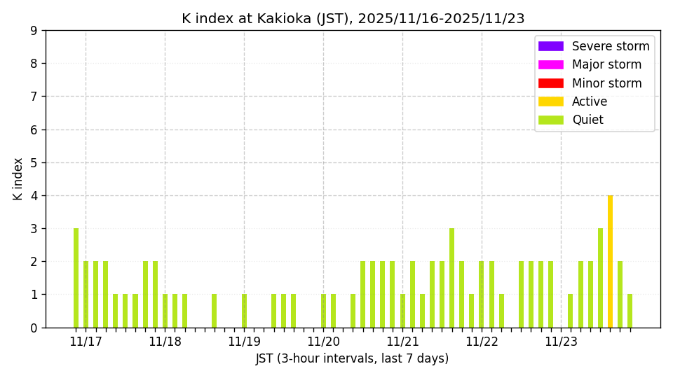 ※3時間ごとのK指数(JST, 過去7日分)。色分けはNICTのアラートレベルに準拠。