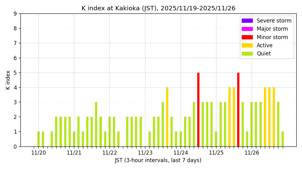 ※3時間ごとのK指数(JST, 過去7日分)。色分けはNICTのアラートレベルに準拠。