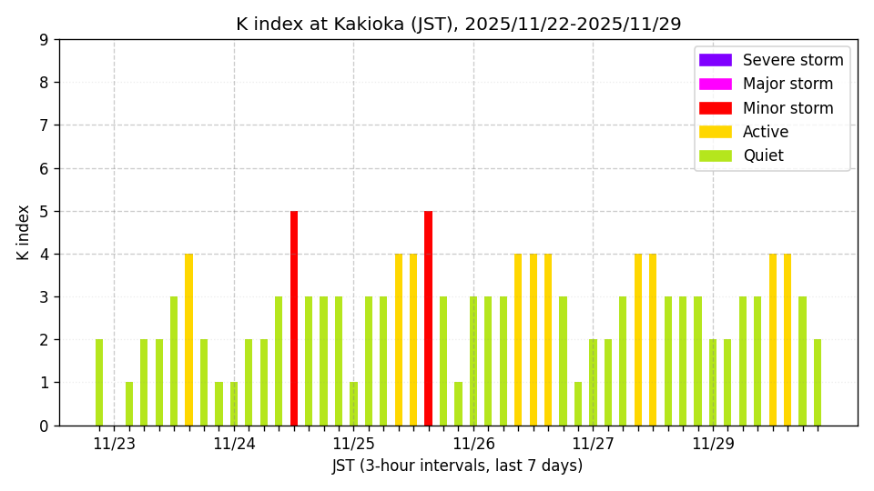※3時間ごとのK指数(JST, 過去7日分)。色分けはNICTのアラートレベルに準拠。