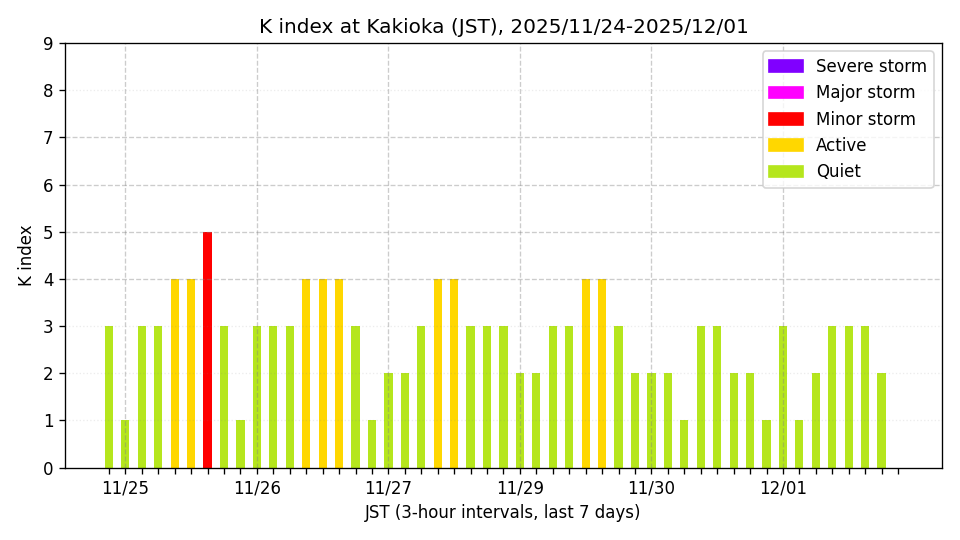 ※3時間ごとのK指数(JST, 過去7日分)。色分けはNICTのアラートレベルに準拠。