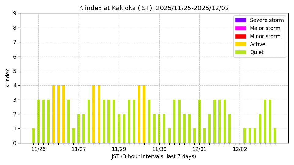 ※3時間ごとのK指数(JST, 過去7日分)。色分けはNICTのアラートレベルに準拠。