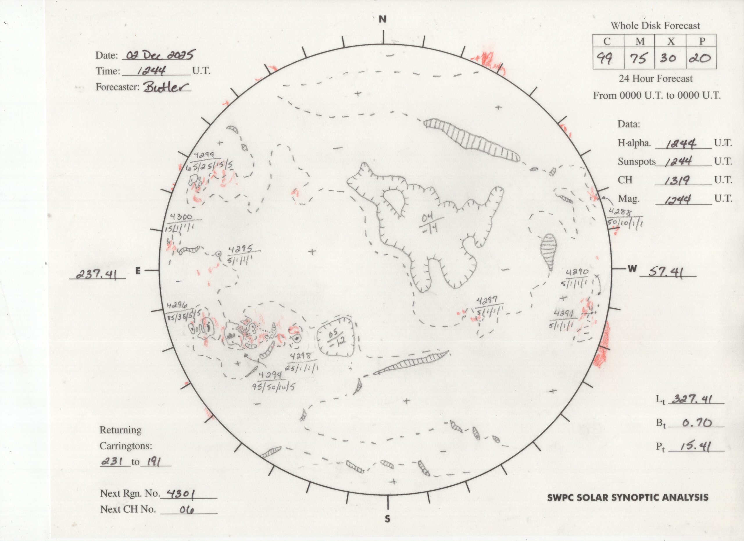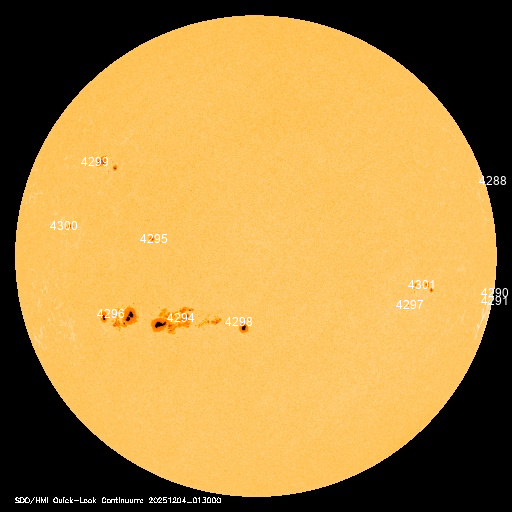 本日のまとめ:先ほど北半球東側にある4300でM6.0の中規模太陽フレアが発生しました。4294と4296は南半球東側にあって複雑な構造を持ちます。大き目な黒点群なので要警戒。黒点数は238、地磁気はSum 24 前後。CME到着予測がありました。X1.9に伴うもので、フィラメントの噴出も伴っていたようです。詳報は各セクションへ。