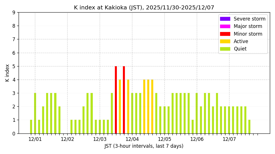 ※3時間ごとのK指数(JST, 過去7日分)。色分けはNICTのアラートレベルに準拠。