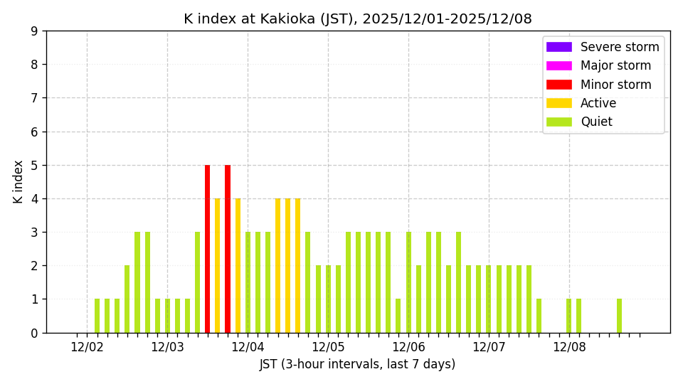 ※3時間ごとのK指数(JST, 過去7日分)。色分けはNICTのアラートレベルに準拠。