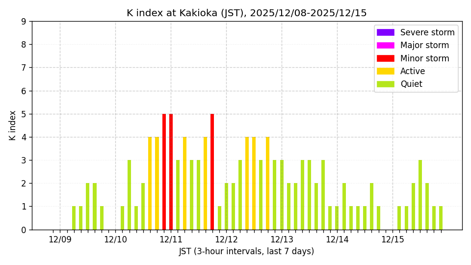 ※3時間ごとのK指数(JST, 過去7日分)。色分けはNICTのアラートレベルに準拠。