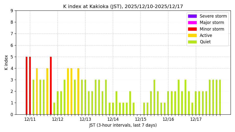 ※3時間ごとのK指数(JST, 過去7日分)。色分けはNICTのアラートレベルに準拠。