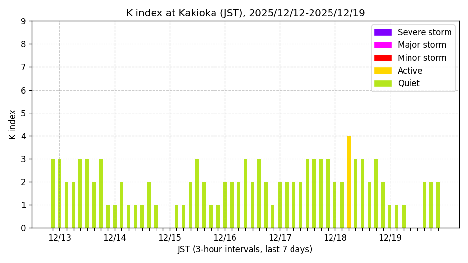 ※3時間ごとのK指数(JST, 過去7日分)。色分けはNICTのアラートレベルに準拠。