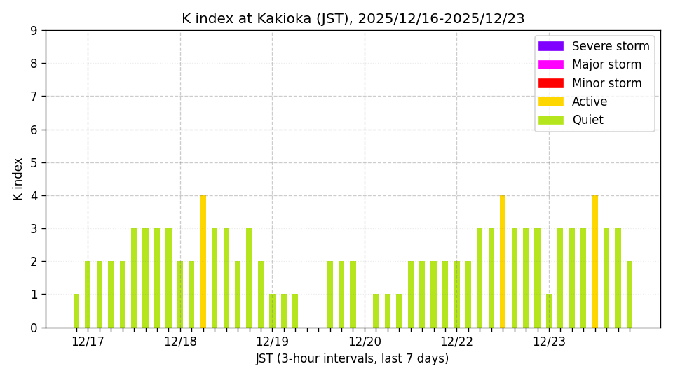 ※3時間ごとのK指数(JST, 過去7日分)。色分けはNICTのアラートレベルに準拠。
