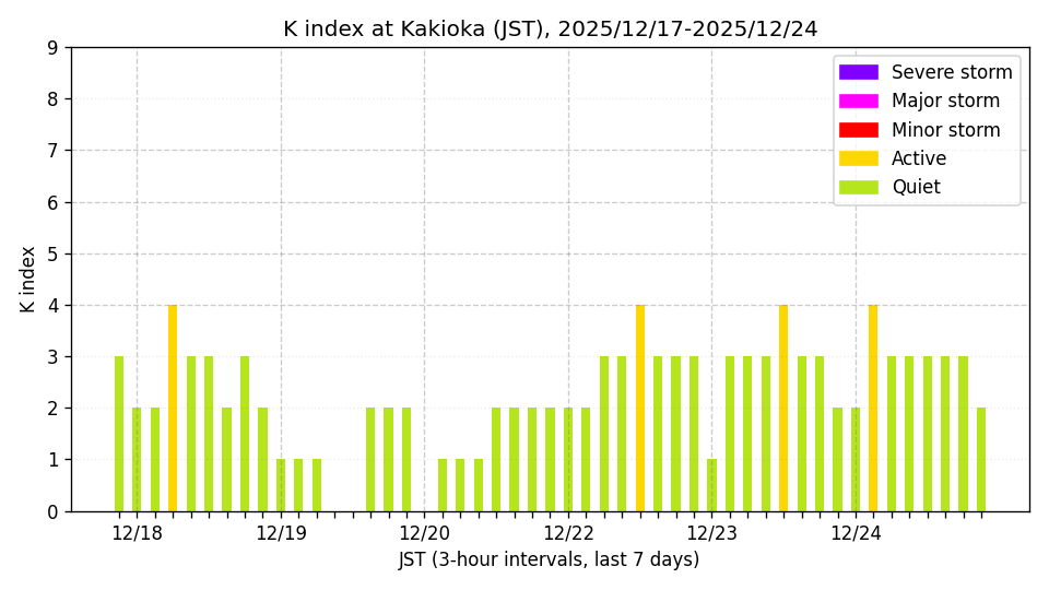 ※3時間ごとのK指数(JST, 過去7日分)。色分けはNICTのアラートレベルに準拠。