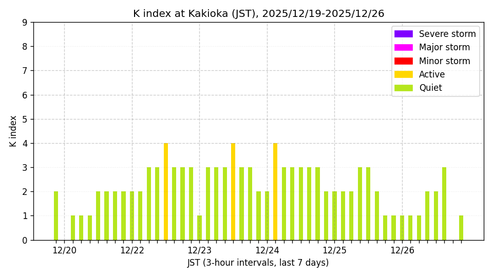 ※3時間ごとのK指数(JST, 過去7日分)。色分けはNICTのアラートレベルに準拠。