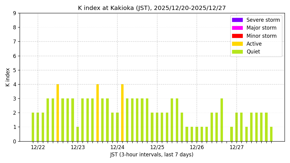 ※3時間ごとのK指数(JST, 過去7日分)。色分けはNICTのアラートレベルに準拠。