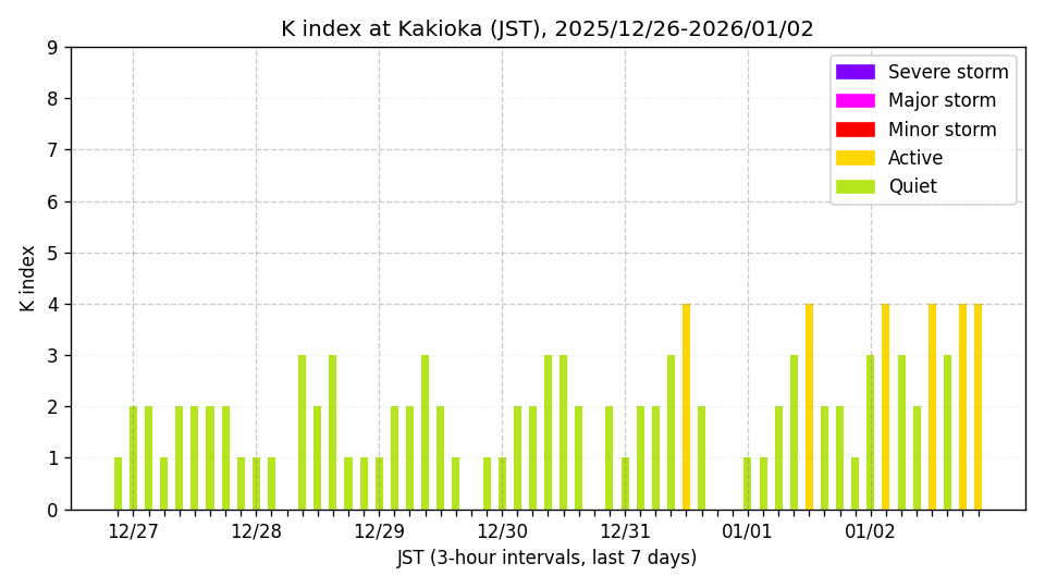 ※3時間ごとのK指数(JST, 過去7日分)。色分けはNICTのアラートレベルに準拠。