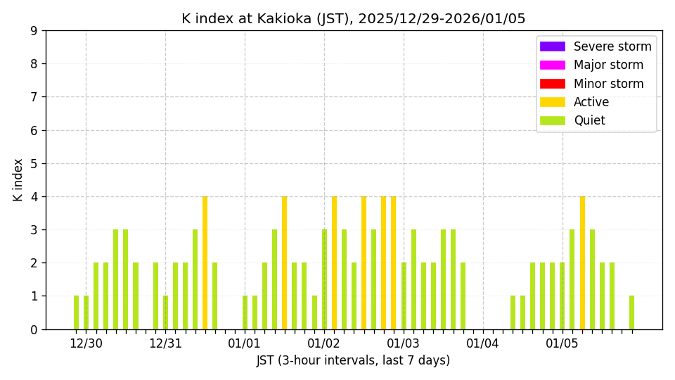 ※3時間ごとのK指数(JST, 過去7日分)。色分けはNICTのアラートレベルに準拠。