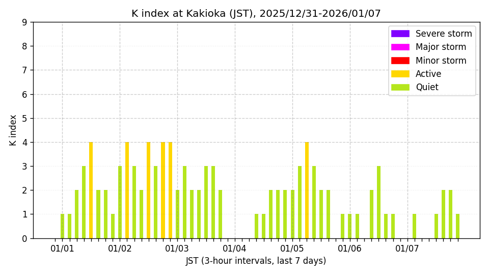 ※3時間ごとのK指数(JST, 過去7日分)。色分けはNICTのアラートレベルに準拠。