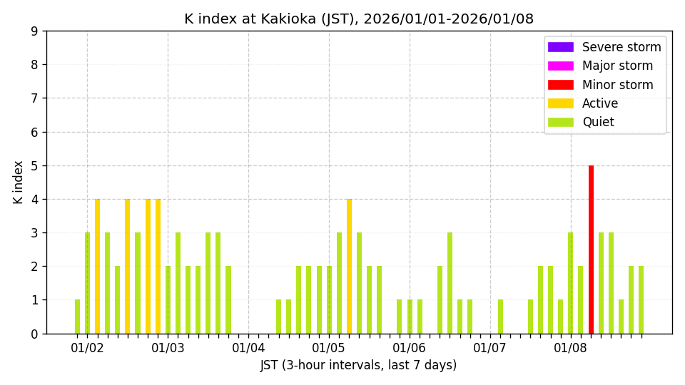 ※3時間ごとのK指数(JST, 過去7日分)。色分けはNICTのアラートレベルに準拠。