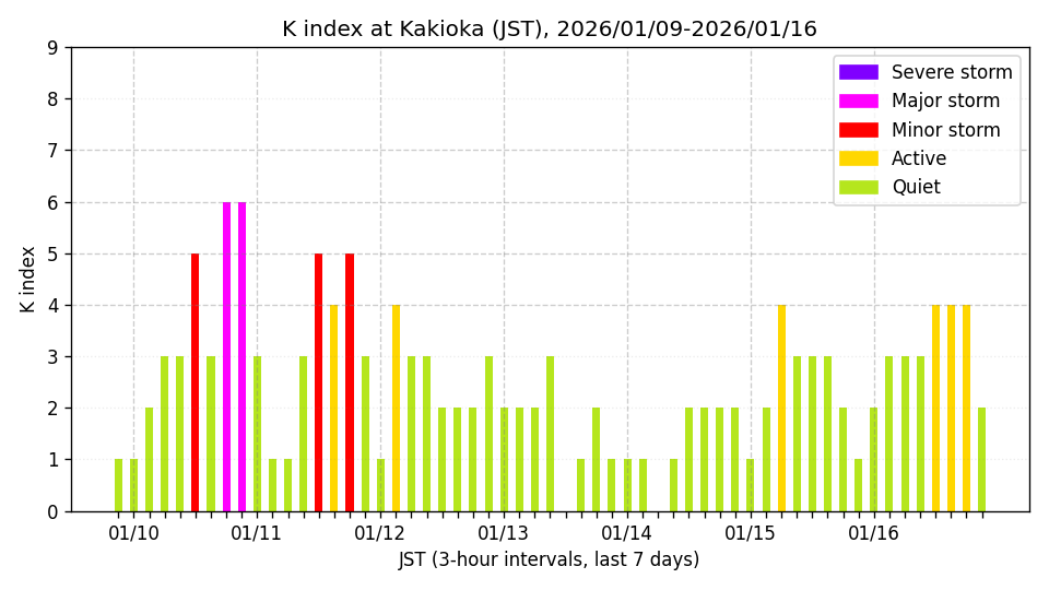 ※3時間ごとのK指数(JST, 過去7日分)。色分けはNICTのアラートレベルに準拠。