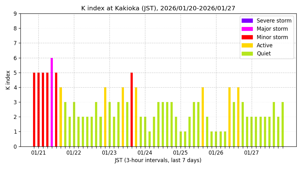 ※3時間ごとのK指数(JST, 過去7日分)。色分けはNICTのアラートレベルに準拠。