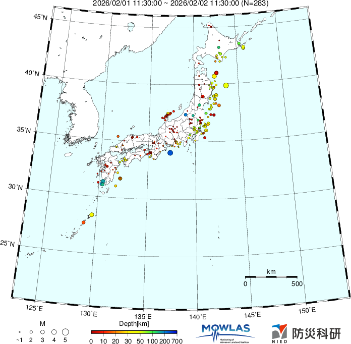 日本全域の最新地震分布