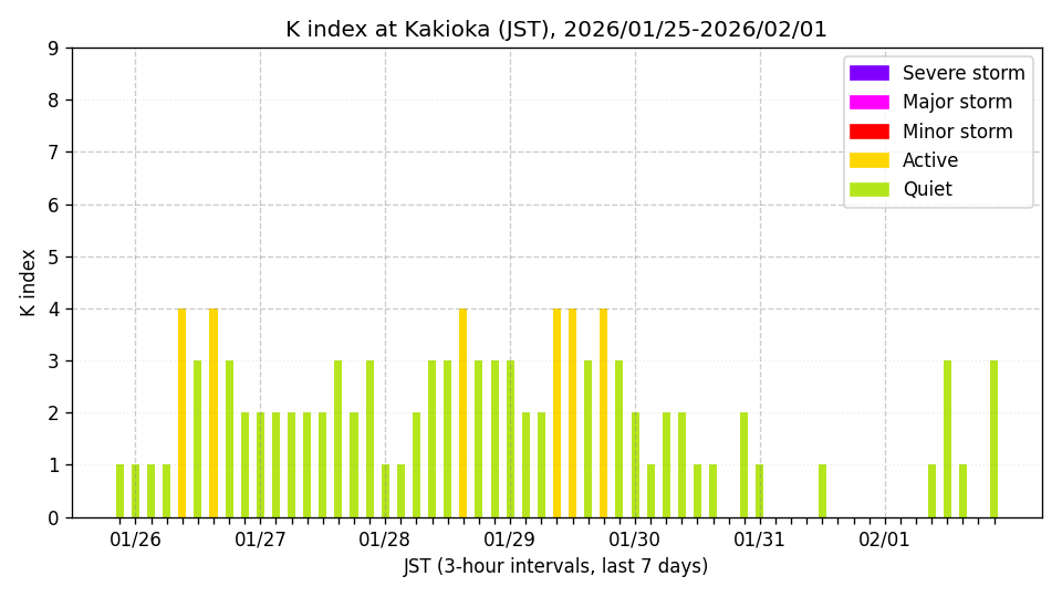 ※3時間ごとのK指数(JST, 過去7日分)。色分けはNICTのアラートレベルに準拠。