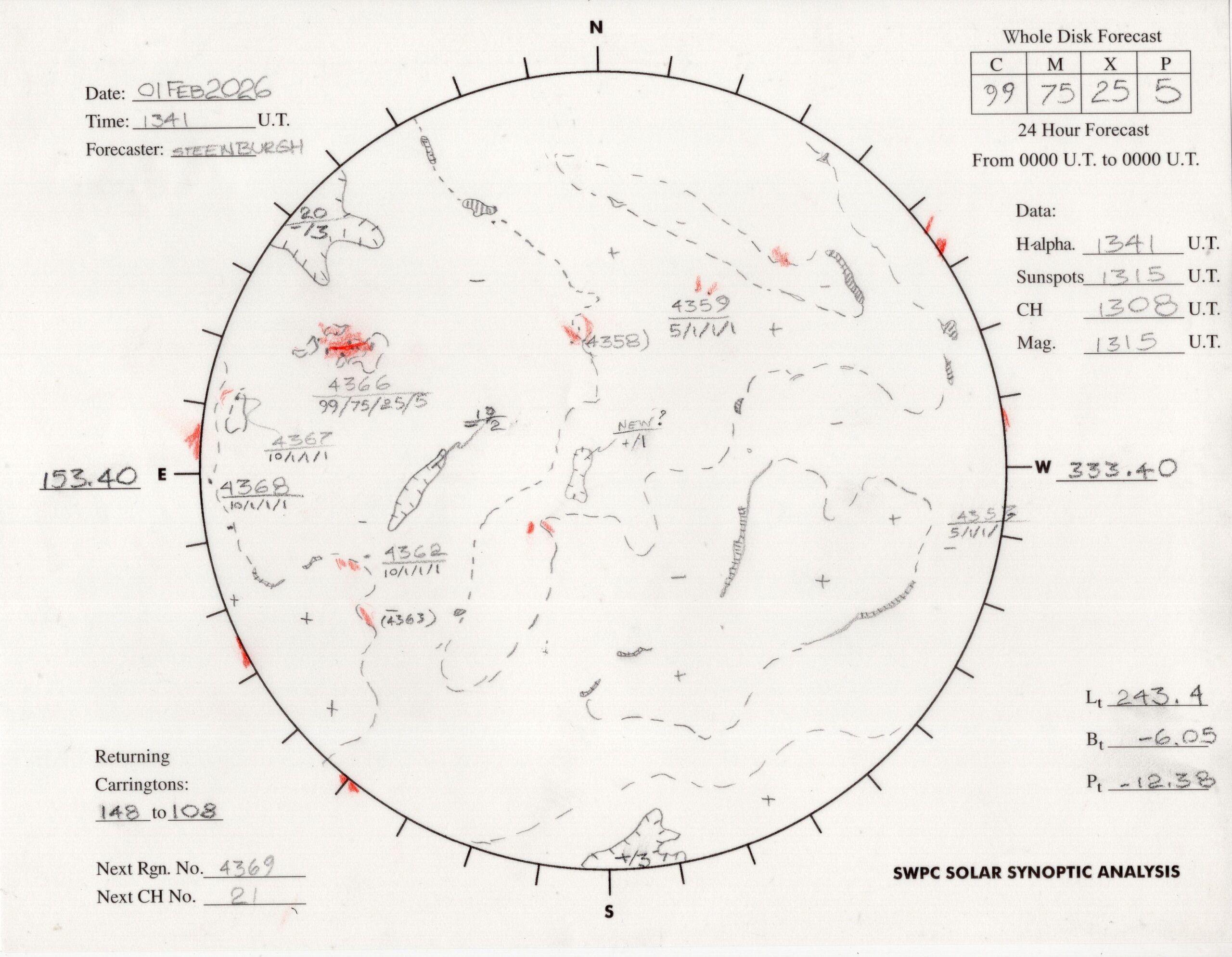 太陽外観図(NOAA)※予報官さんの手書き