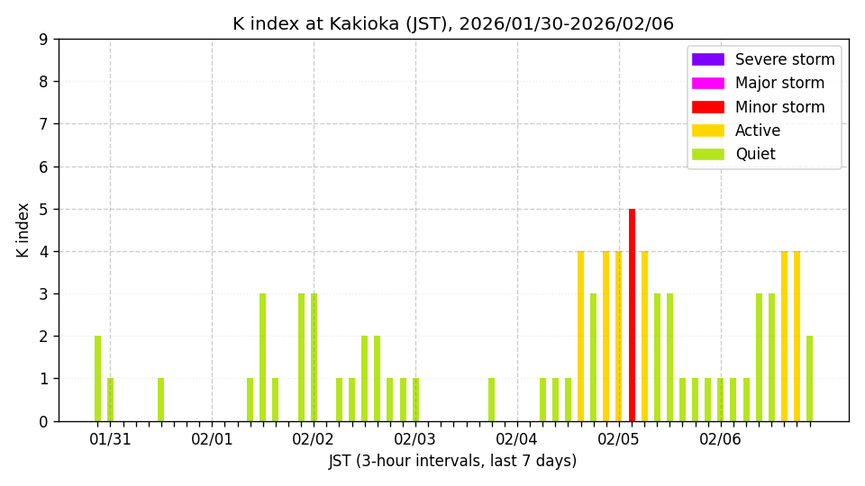 ※3時間ごとのK指数(JST, 過去7日分)。色分けはNICTのアラートレベルに準拠。