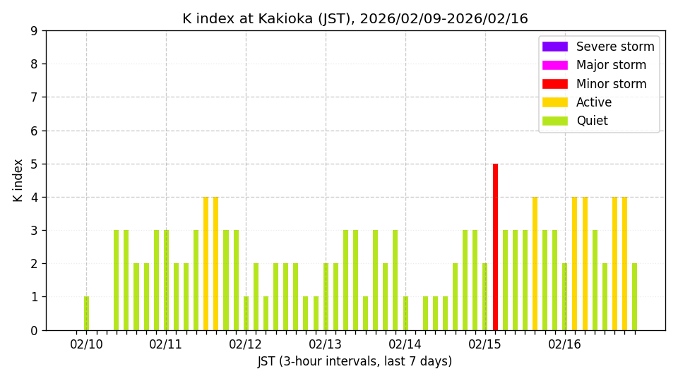 ※3時間ごとのK指数(JST, 過去7日分)。色分けはNICTのアラートレベルに準拠。