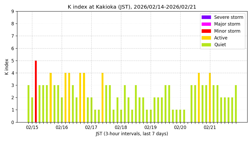 ※3時間ごとのK指数(JST, 過去7日分)。色分けはNICTのアラートレベルに準拠。