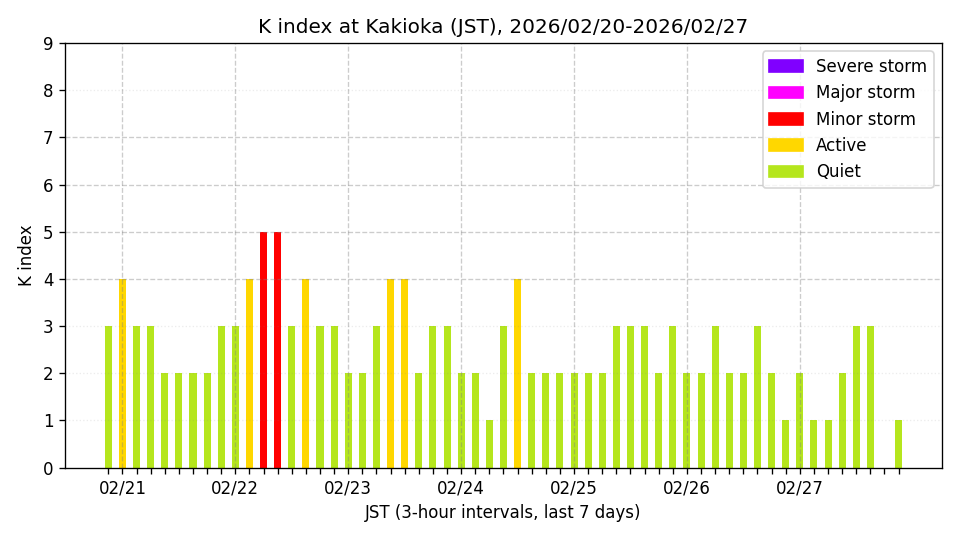 ※3時間ごとのK指数(JST, 過去7日分)。色分けはNICTのアラートレベルに準拠。