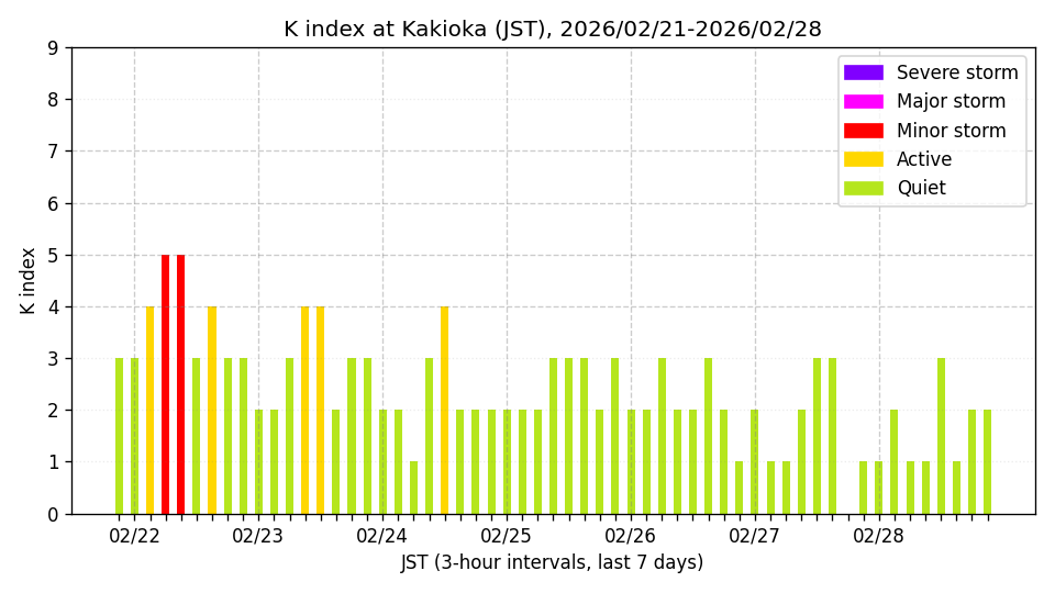 ※3時間ごとのK指数(JST, 過去7日分)。色分けはNICTのアラートレベルに準拠。