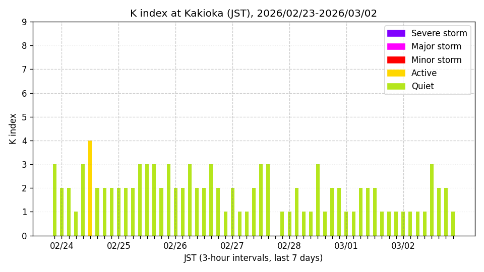 ※3時間ごとのK指数(JST, 過去7日分)。色分けはNICTのアラートレベルに準拠。