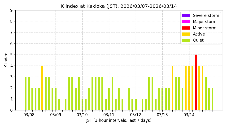 ※3時間ごとのK指数(JST, 過去7日分)。色分けはNICTのアラートレベルに準拠。