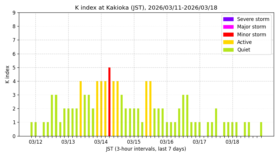 ※3時間ごとのK指数(JST, 過去7日分)。色分けはNICTのアラートレベルに準拠。