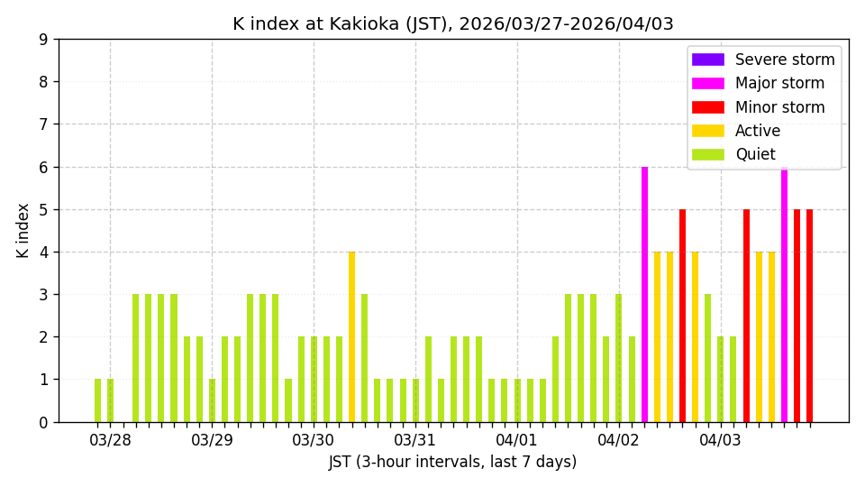 ※3時間ごとのK指数(JST, 過去7日分)。色分けはNICTのアラートレベルに準拠。