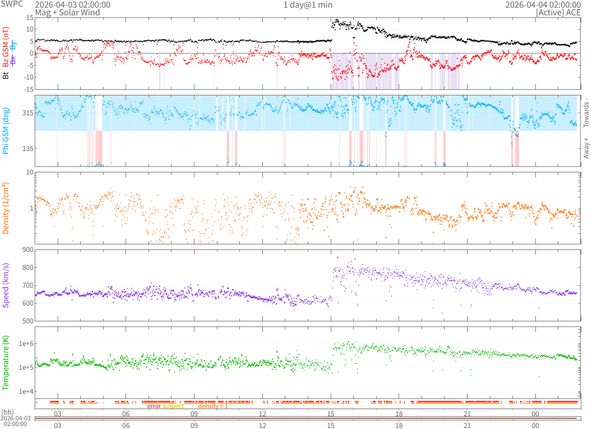 600km/s前後で推移していましたが日付が変わる頃から800km/sまで一気に上がりました。その後徐々に下がり、現在は650km/s前後で推移しています