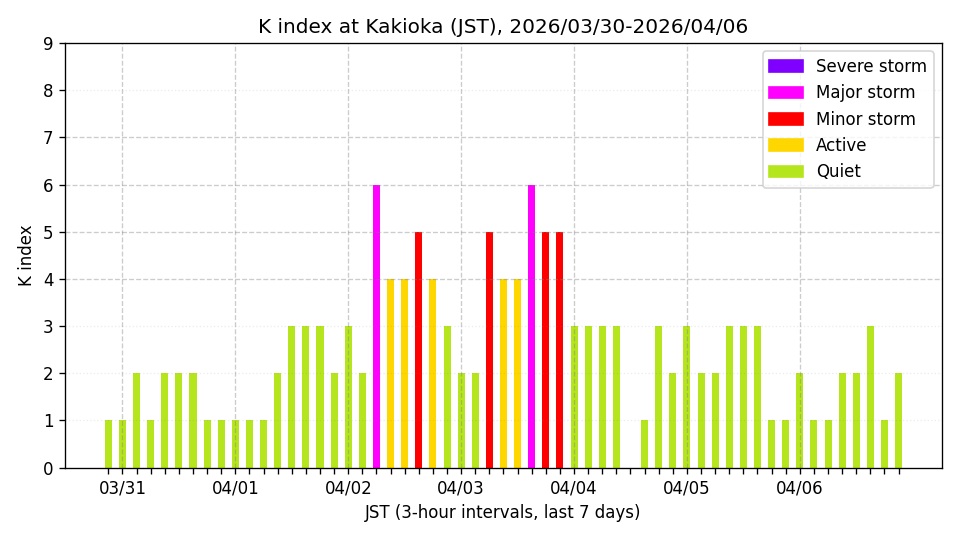 ※3時間ごとのK指数(JST, 過去7日分)。色分けはNICTのアラートレベルに準拠。