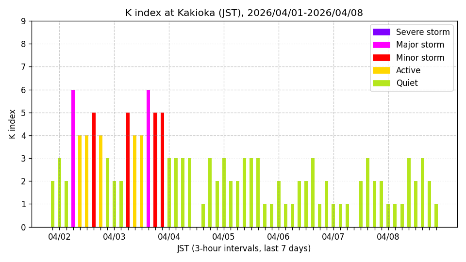 ※3時間ごとのK指数(JST, 過去7日分)。色分けはNICTのアラートレベルに準拠。