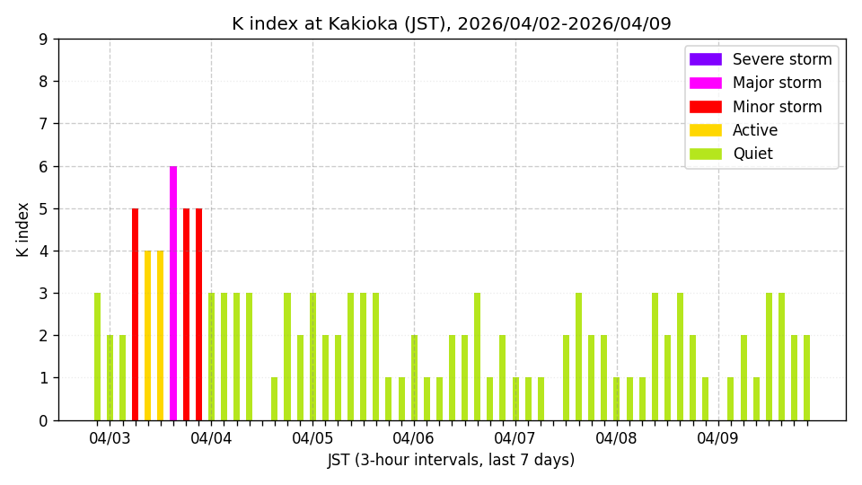 ※3時間ごとのK指数(JST, 過去7日分)。色分けはNICTのアラートレベルに準拠。