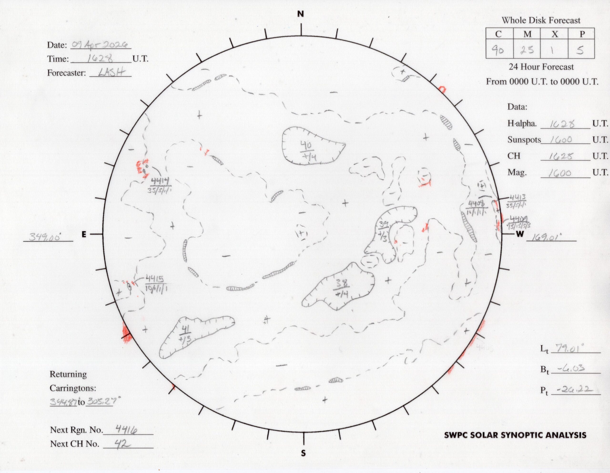 本日のまとめ:西端の4409で中規模(M級)フレアが継続。黒点数は090、地磁気はSum 14 前後。詳報は各セクションへ。